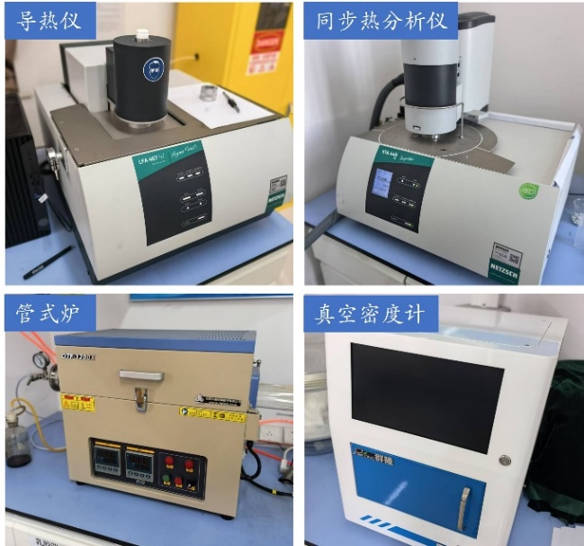 实验室内配备有先进的材料热性质测试设备。同步热分析仪能够测试材料的熔点、潜热、比热、分解温度等;闪射法导热仪能够测试材料的热扩散系数和热导率,特别是能够对液态或熔融态物质进行测试;此外还配备了电化学工作站、真空密度计、管式炉、井式炉、箱式炉、手套箱、烘干箱、超声分散仪、超纯水设备等。