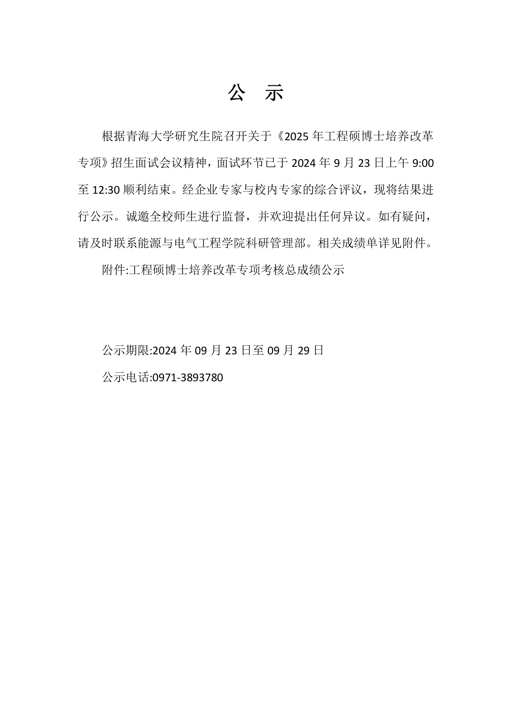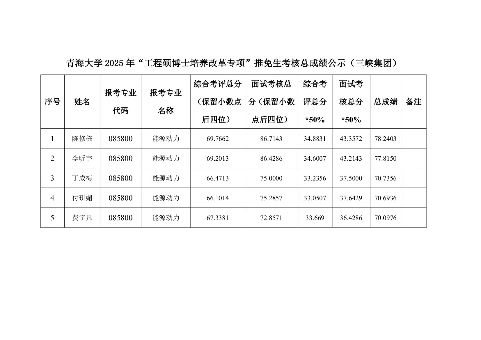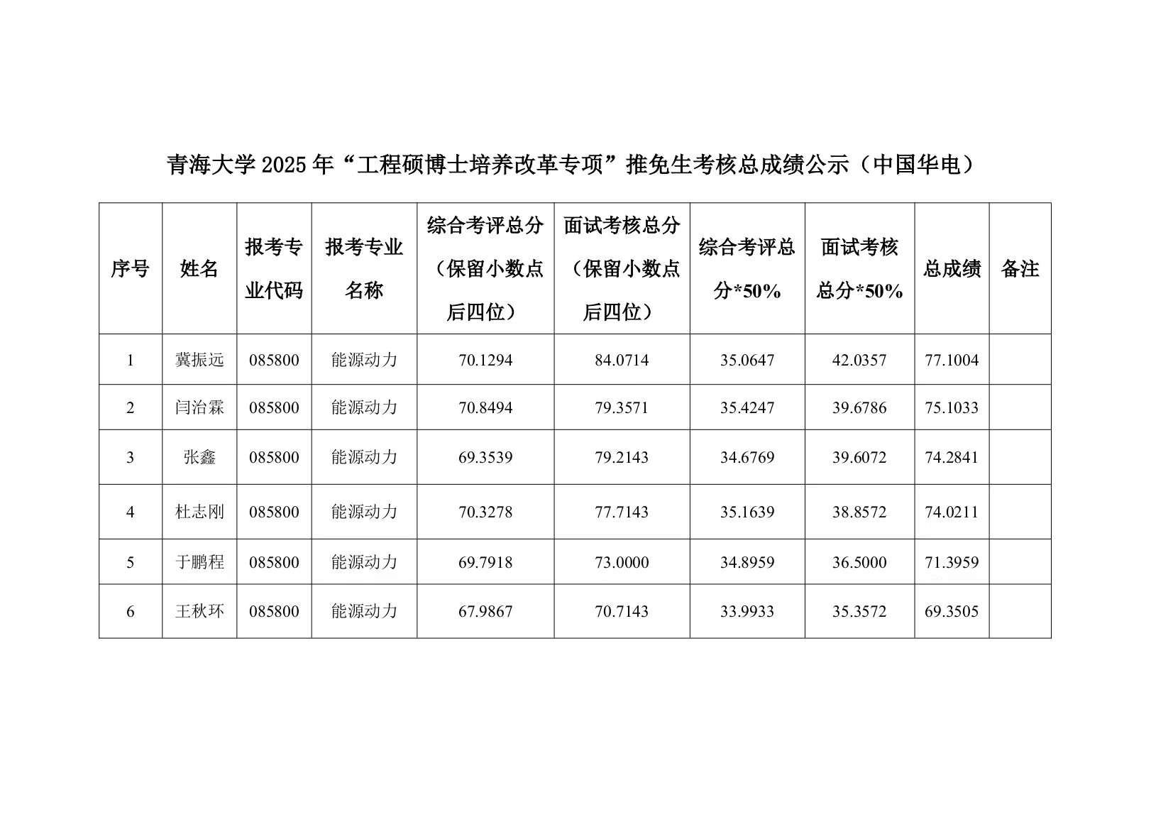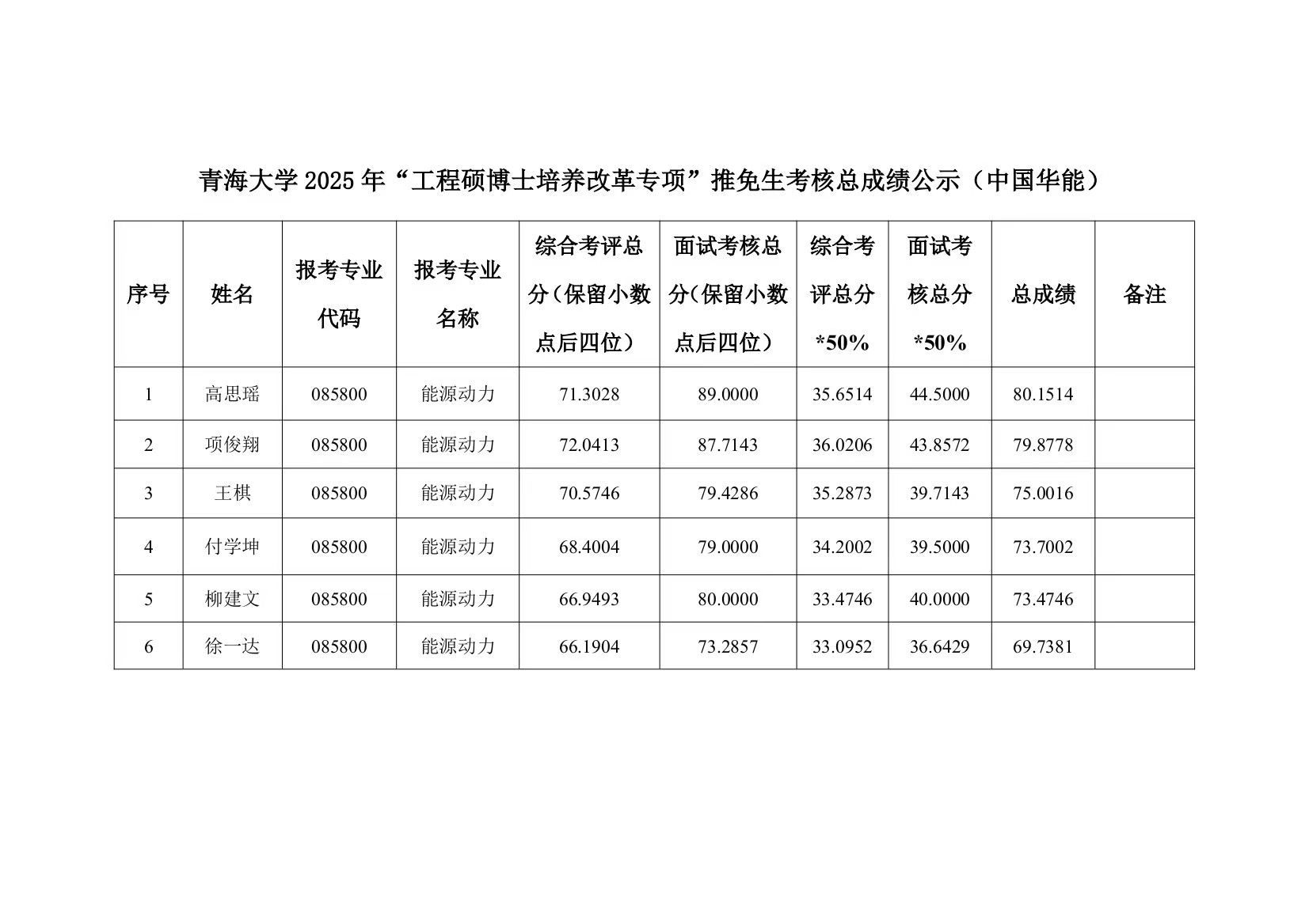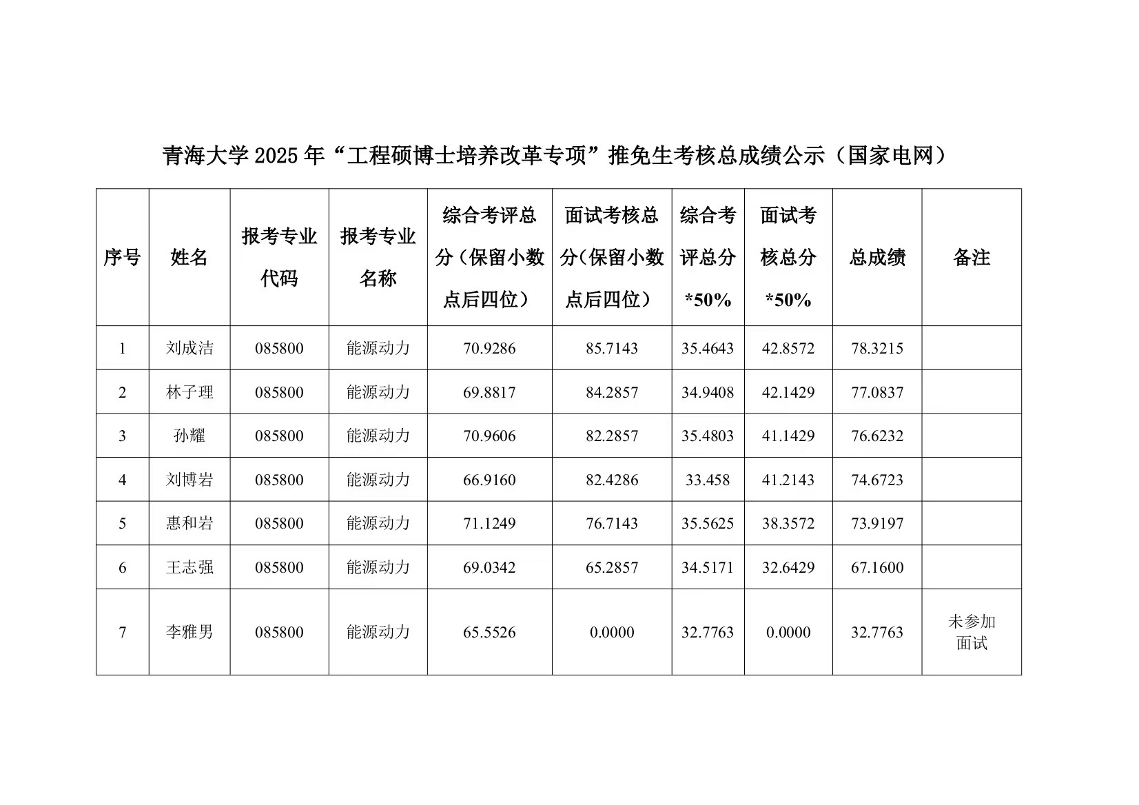 能源动力工程硕士专项计划考核成绩公示