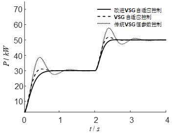 在Matlab/Simulink软件搭建了仿真模型,并以雷速体育 新型多元储能技术试验平台的压缩空气储能子系统高速透平发电机参数为例进行了仿真验证。仿真结果表明,采用改进的VSG自适应控制策略后,系统的频率响应性能得到了明显改善。与传统恒参数VSG控制和传统VSG自适应控制相比,改进后的策略在系统发生功率扰动时,频率偏差减少了0.6 rad/s,调节时间缩短了0.3秒,超调量降低了1.9%,有功功率输出的平滑度、响应速度以及超调量等方面都表现出了显著的优势。